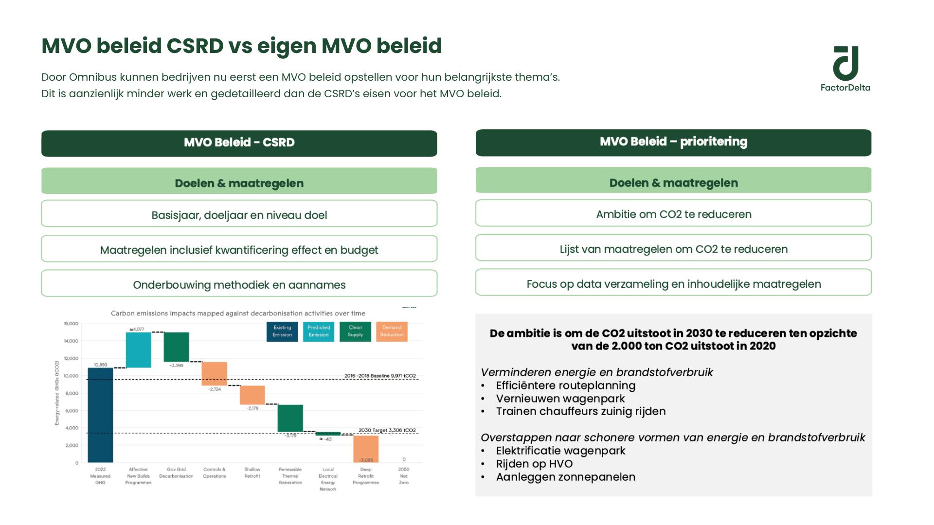 Het verschil tussen een MVO beleid gebaseerd op de CSRD's eisen vs. een eigen MVO beleid gebaseerd op strategische thema's.