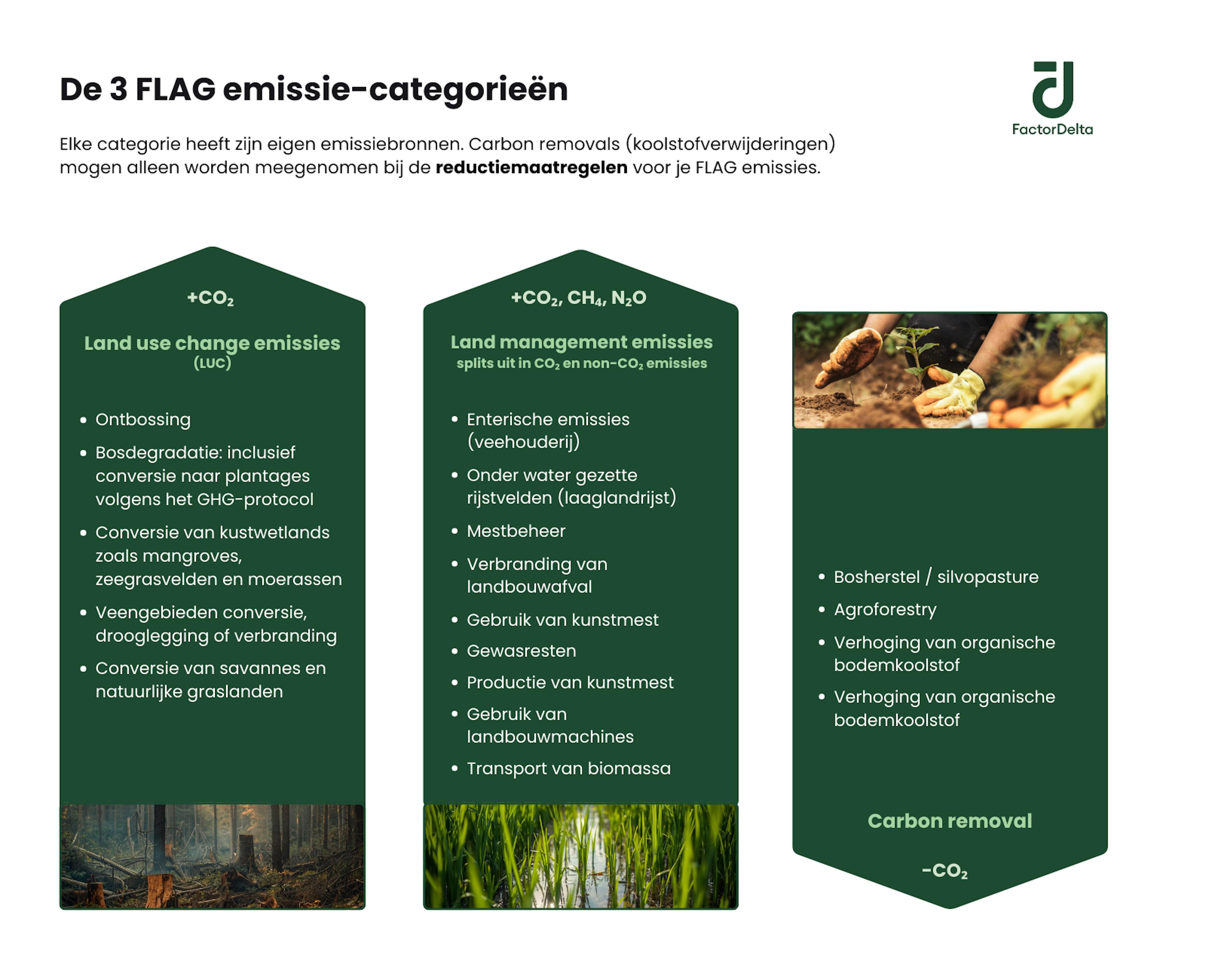 Reguliere SBTs richten zich op fossiele emissies (energie, transport, productie). FLAG richt zich op drie land-gerelateerde emissie categorieën: