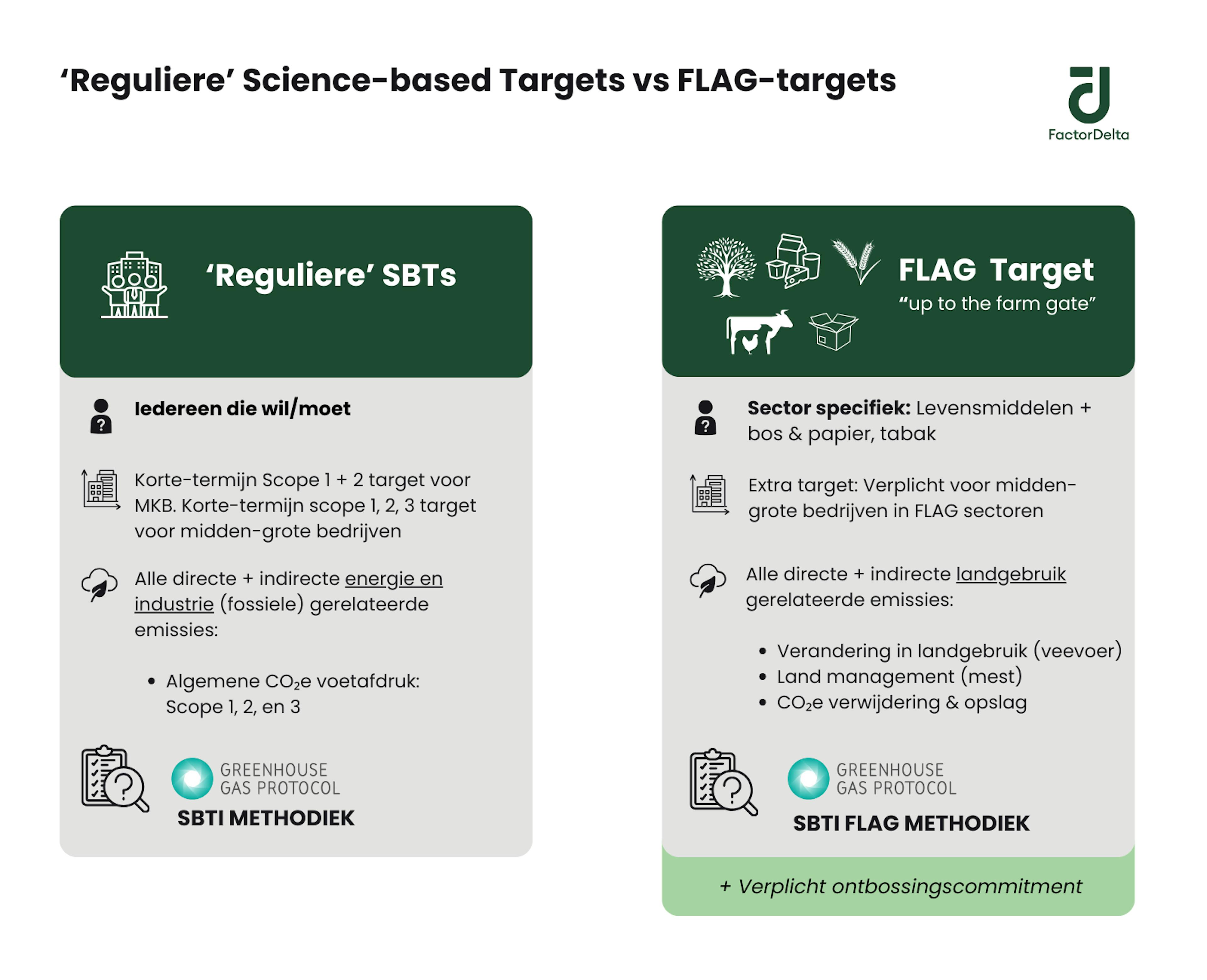 FLAG-targets zijn extra Science-Based Targets (SBTs) voor bedrijven die veel uitstoot hebben uit landgebruik. FLAG staat voor Forest, Land and Agriculture en richt zich op emissies én koolstofopslag uit landbouw, landbeheer en bosbouw.